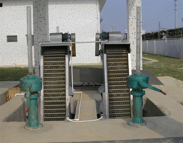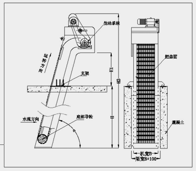 按水流方向耙齒鏈類同于格柵,在耙齒鏈軸上裝配的耙齒間隙可以根據(jù)使用條件進(jìn)行選擇,當(dāng)耙齒把流體中的固態(tài)懸浮物以及漂浮物分離后可以保證水流暢通流過,整個(gè)過程可以是連續(xù)的,也可以是間歇的。