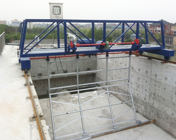 概述: 該設(shè)備適用于逆向流平流式沉淀池及沉砂池中污泥,砂及浮渣的機(jī)械排除,多用于初次沉淀池,逆向流刮泥順流排渣,刮泥機(jī)構(gòu)在不刮泥回程時(shí)刮泥耙全部抬起,當(dāng)回到刮泥的起始位置時(shí),刮泥耙落下。 設(shè)備結(jié)構(gòu)及工作原理: 該設(shè)備由護(hù)欄、刮泥桁架、刮泥耙及導(dǎo)軌、刮泥橋、行走輪、軌道、提升機(jī)構(gòu)、驅(qū)動(dòng)機(jī)輪等組成。 刮泥機(jī)構(gòu)在不刮泥回程時(shí)刮泥耙全部抬起,當(dāng)回到刮泥的起始位置時(shí),刮泥耙落下,這樣周而復(fù)始的工作,該設(shè)備為同向流刮泥和刮渣,刮起泥耙靠卷?yè)P(yáng)機(jī)構(gòu)升降,刮浮渣耙靠電動(dòng)桿升降,以達(dá)到刮起泥渣的目的。