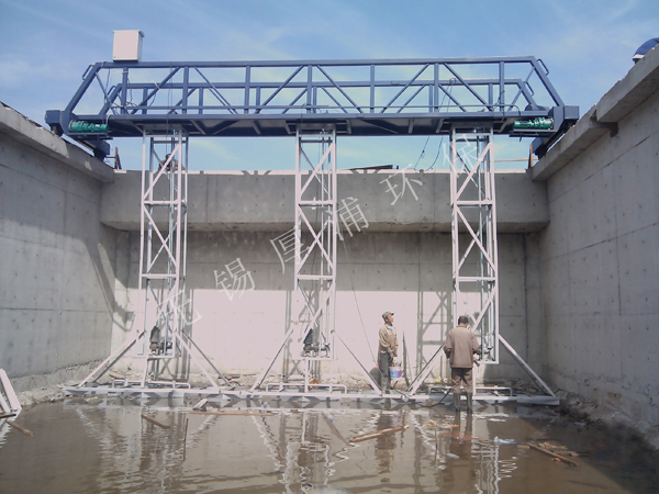 概述: 行車式吸泥機(jī)又稱橋式吸泥機(jī),是給水工程中平流式沉淀池和污水處理工程中二次平流式沉淀池等專用排泥設(shè)備。該機(jī)可以克服活性污泥比重小含水率高二難以刮集的困難,目前我公司生產(chǎn)的桁架式吸泥機(jī)分為斜板(管)虹吸式吸泥機(jī)、不帶斜板(管)吸泥機(jī)和泵吸式吸泥機(jī)等三種。 工作原理: 吸泥機(jī)可根據(jù)用戶要求,選擇虹吸式或泵吸式,虹吸式采用潛水泵配水射器或真空泵,泵吸式直接采用潛污泵抽取沉淀池污泥,利用沉淀池與排泥槽內(nèi)的液位差排泥。該機(jī)可邊行走邊吸泥,可依據(jù)泥量的多少來確定排泥次數(shù),排泥效率高,操作方便。