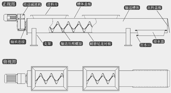 壓榨螺旋采用無軸螺旋,下襯耐磨尼龍襯板,增加了輸送長度,壓榨部分為平送壓榨結(jié)構(gòu)。