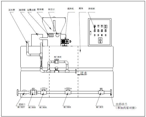 干粉絮凝劑從螺旋推進(jìn)器內(nèi)進(jìn)入速溶器內(nèi)與清水進(jìn)行預(yù)混,被濕潤的物料進(jìn)入配制槽進(jìn)行攪拌稀釋,按要求濃度進(jìn)行配制;配制過程中,進(jìn)水量在流量計觀測下必須相對穩(wěn)定,從而保證在整個工作工程中,配制溶液濃度不變。