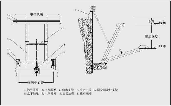 XB旋轉(zhuǎn)式潷水器主要由電控箱、電動(dòng)推桿、潷水主管及支管、堰槽組件、浮筒組件、出水組件、行程控制、底座等部分組成。旋轉(zhuǎn)式潷水器由電動(dòng)推桿把水下部分與執(zhí)行機(jī)構(gòu)連接起來(lái),當(dāng)需要排水時(shí),中央控制系統(tǒng)會(huì)給出信號(hào),指令電機(jī)驅(qū)動(dòng)螺桿旋轉(zhuǎn),電動(dòng)推桿向前推出,集水堰槽隨水平管的轉(zhuǎn)動(dòng)而下降,開(kāi)始潷水,排出的上清液由排水管排出,當(dāng)潷水結(jié)束后,推桿內(nèi)計(jì)數(shù)器給出信號(hào),電機(jī)反轉(zhuǎn),牽引集水堰槽上移,回到預(yù)置位置,等待完成下一個(gè)循環(huán)。
