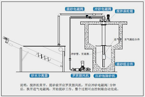 由于葉輪葉漿向上傾斜,旋轉(zhuǎn)時(shí)將使池中的污水呈螺旋狀加速,形成渦流態(tài),產(chǎn)生留心力。同時(shí)池內(nèi)污水流在葉輪葉片攪拌剪切力的作用下,互相剝離,依靠砂的自身重力和旋流的離心力,使砂粒沿池壁呈螺旋線加速沉降,向中心砂斗積聚,經(jīng)氣提或泵提升后排出池外作進(jìn)一步的處理。在此過(guò)程中,適當(dāng)?shù)臉~角度和線速度條件,使污水中的砂粒受到?jīng)_刷,并保持好的沉降效果,而原來(lái)粘附在砂粒上的有機(jī)物,以及重量小的物質(zhì),隨污水一同流出旋流沉砂池,進(jìn)入后續(xù)工序繼續(xù)處理,砂與少量污水進(jìn)入池外砂水分離器內(nèi),砂經(jīng)分離后外排,污水回流至格柵井。